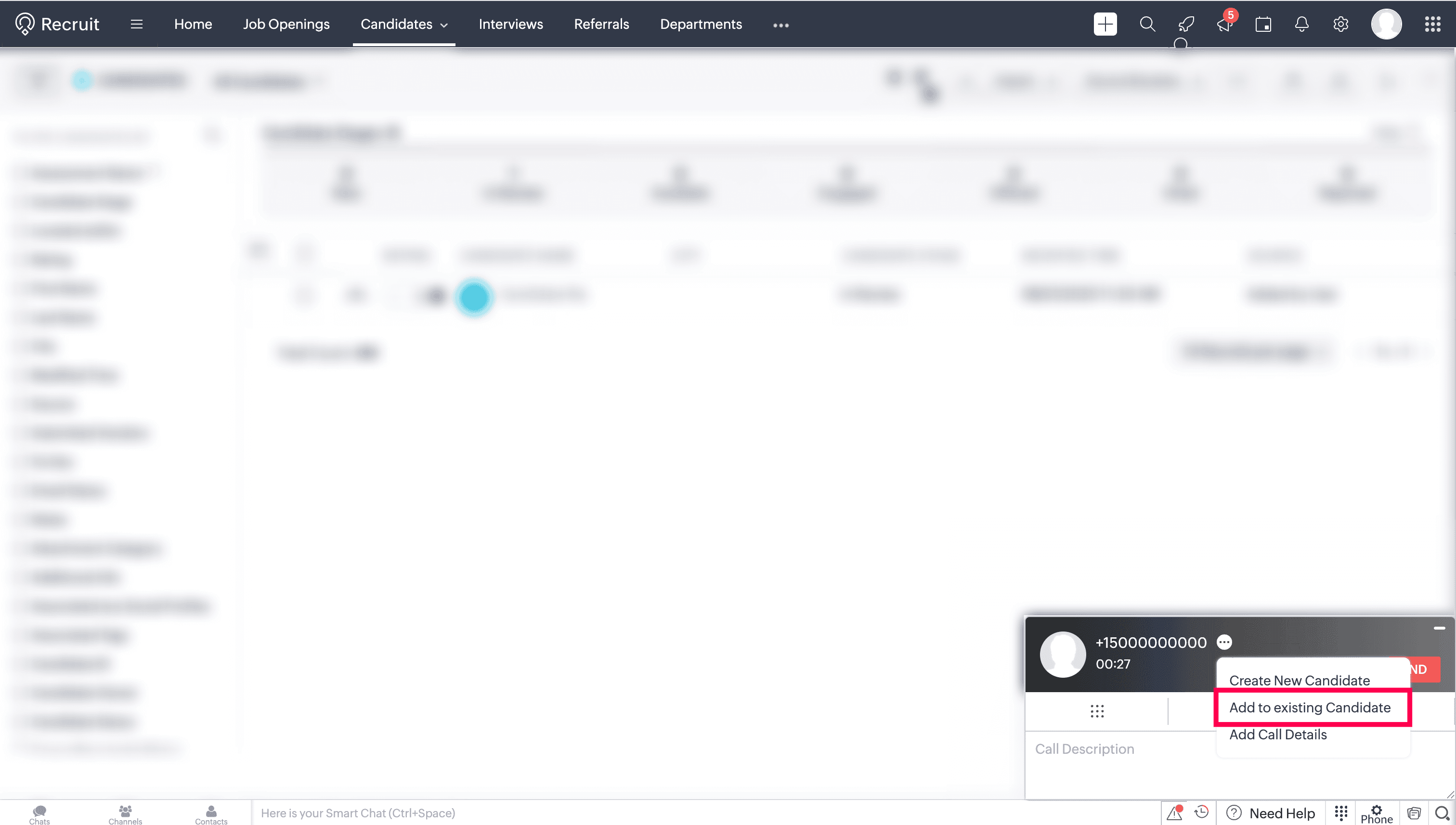 During or after a call, the new number can be added to an existing candidate in Zoho Recruit.