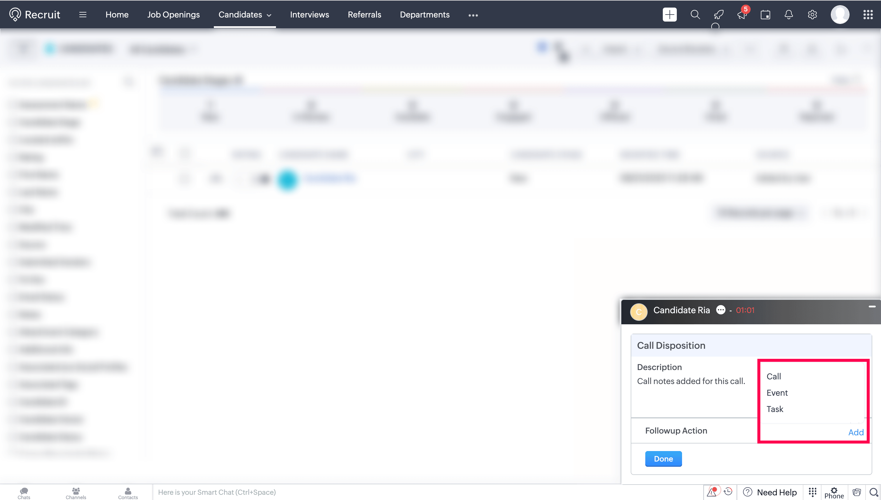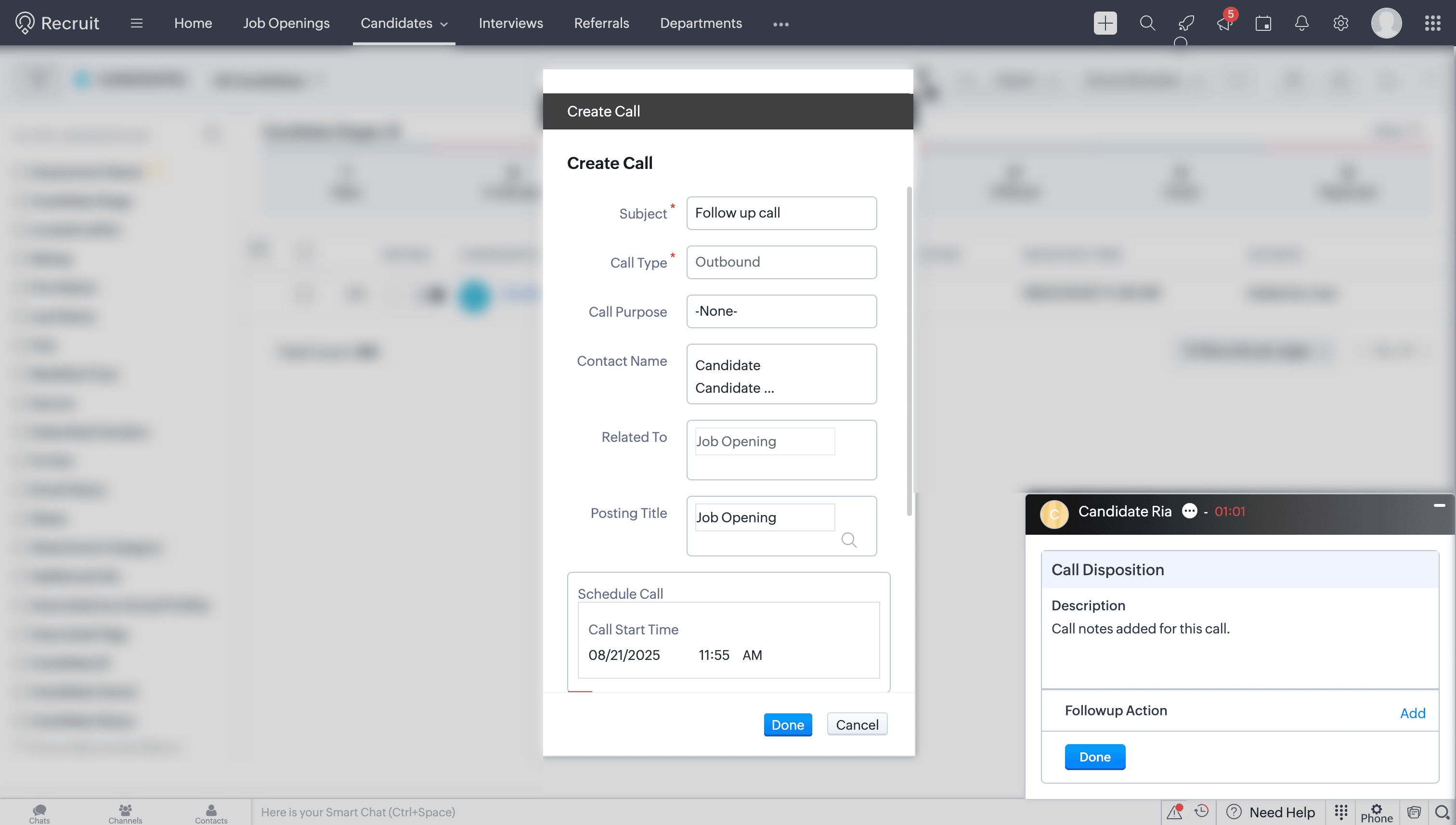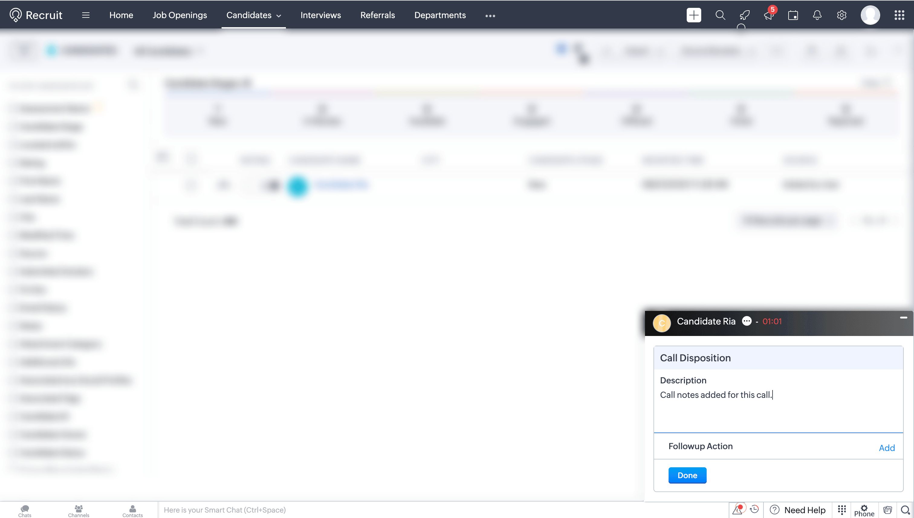 After a call ends, you can add notes related to the current call in the Call Disposition → Description section. Add the notes and click Done. These notes will be saved against the corresponding call log entry in the To-Dos module of Zoho Recruit.