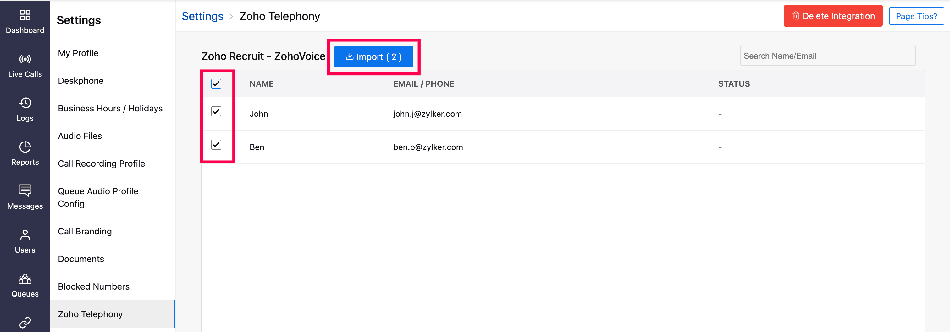 All your agents selected from the Zoho Recruit portal will be listed. Select the users you want to import, then click the Import button.