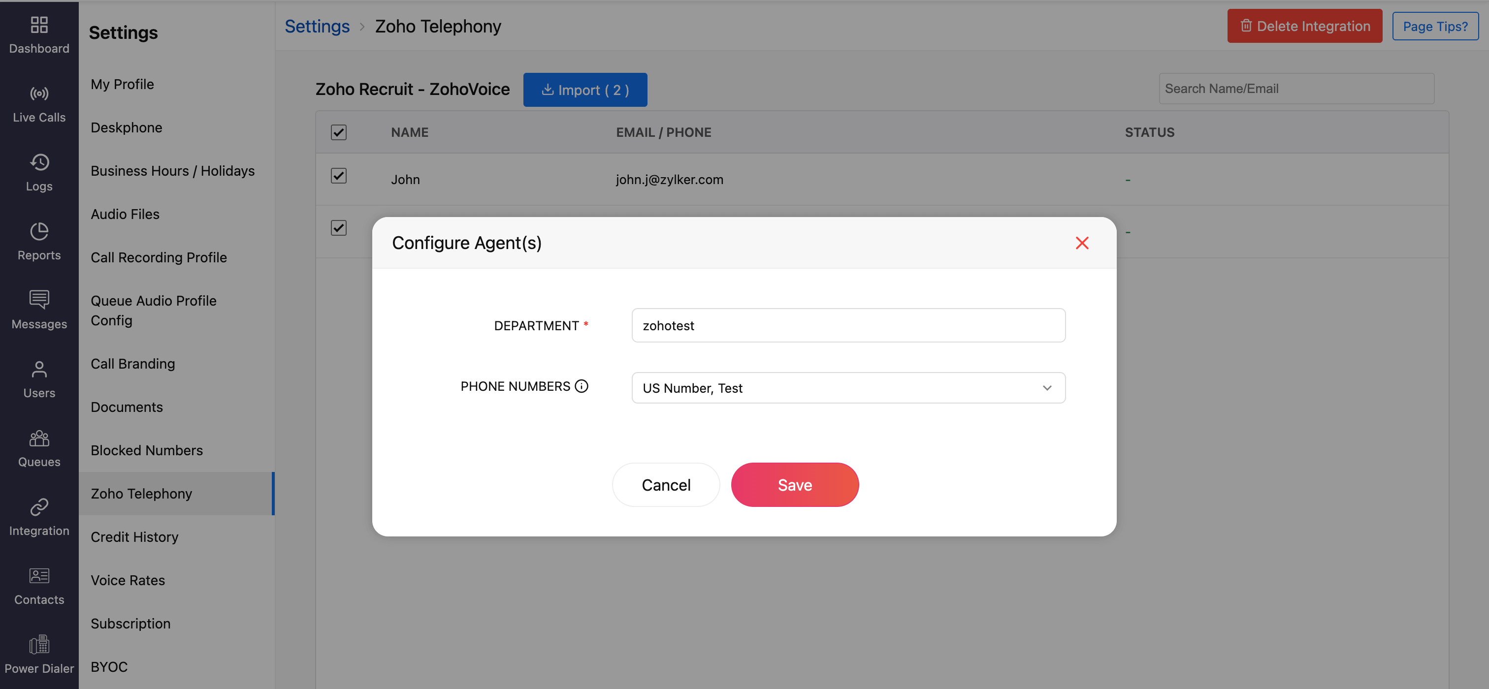 Calls will work in Zoho Recruit only if you assign phone numbers to your admin and telephony agents in Zoho Voice. To assign numbers: