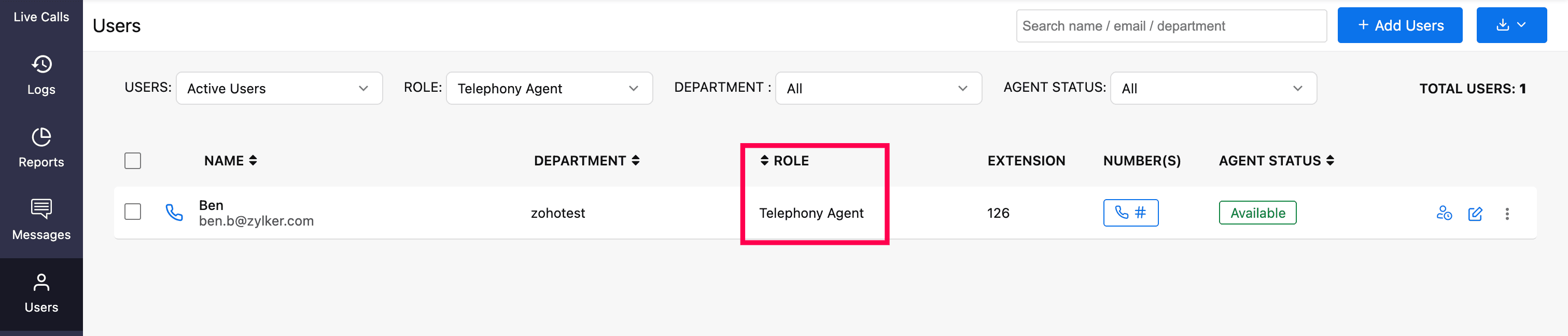 Once you have imported your agents, all the agents will be displayed as Telephony Agent (for Standard & Contact Center plans) in the Users module.