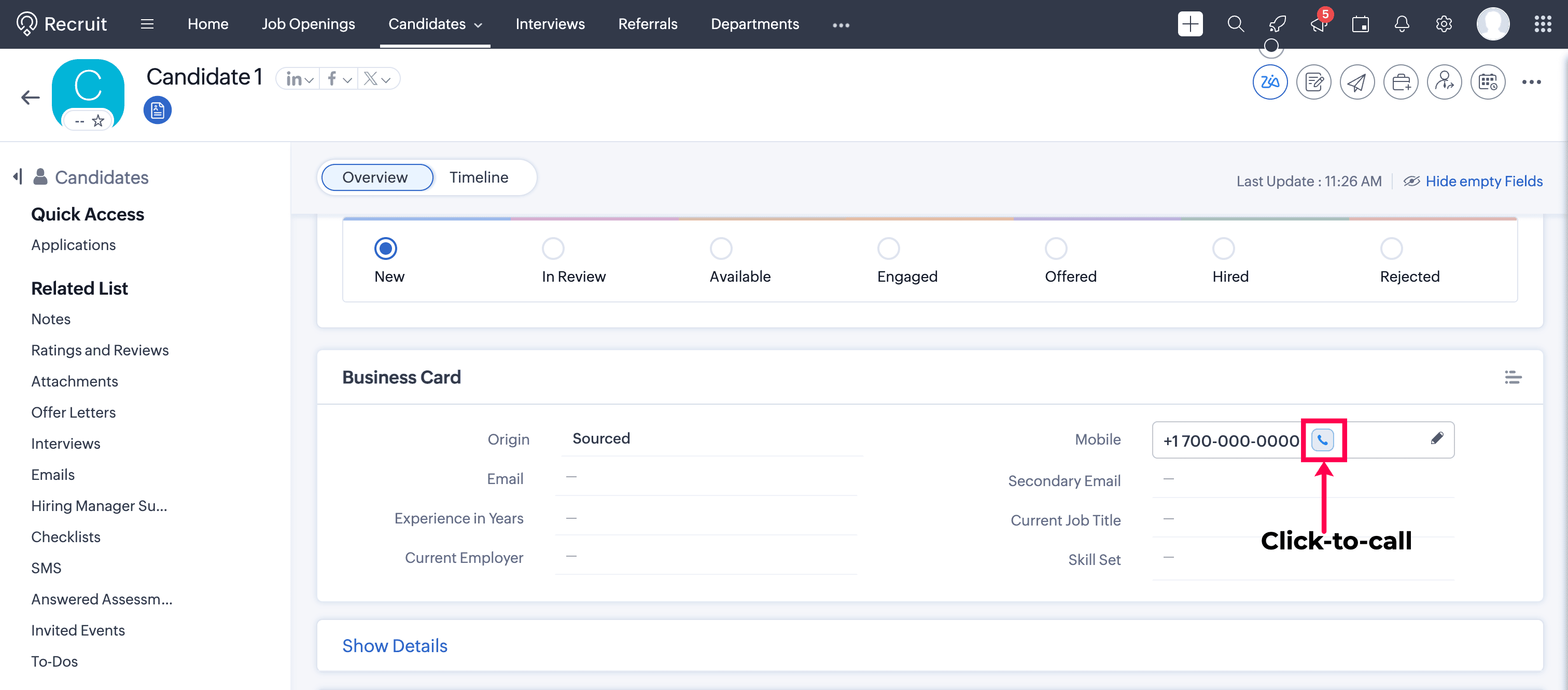 You can initiate calls using the click-to-call button found next to phone numbers in Zoho Recruit.