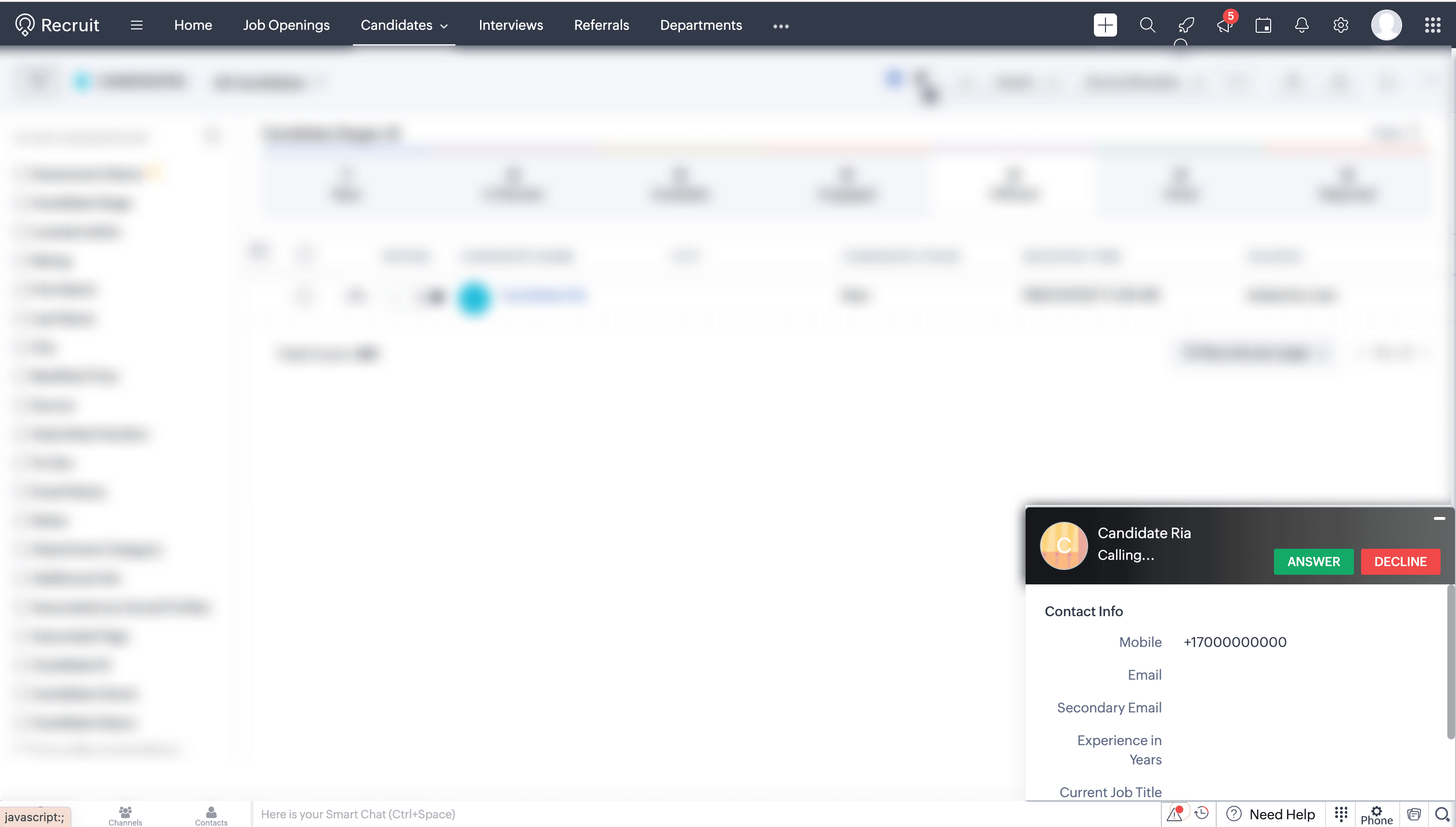 Caller information is displayed through on-screen pop-ups, enabling you to identify the caller immediately. The details are automatically retrieved from Zoho Recruit.