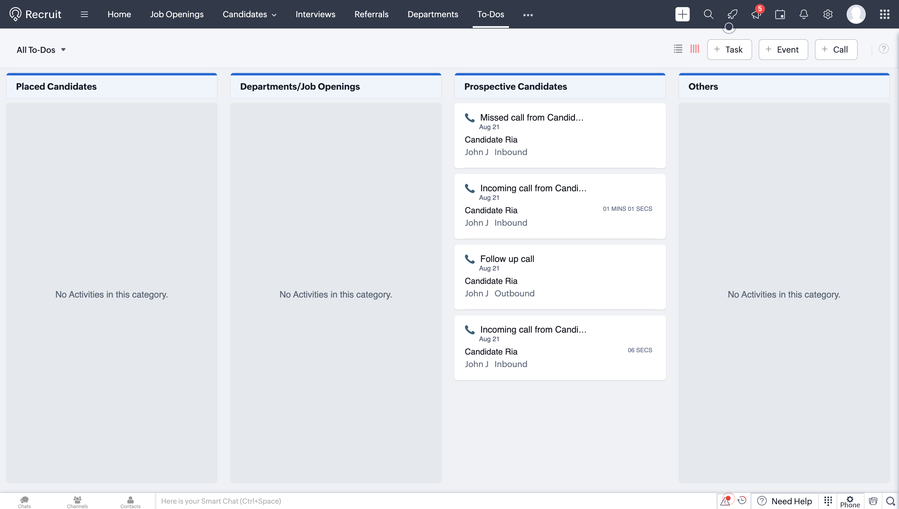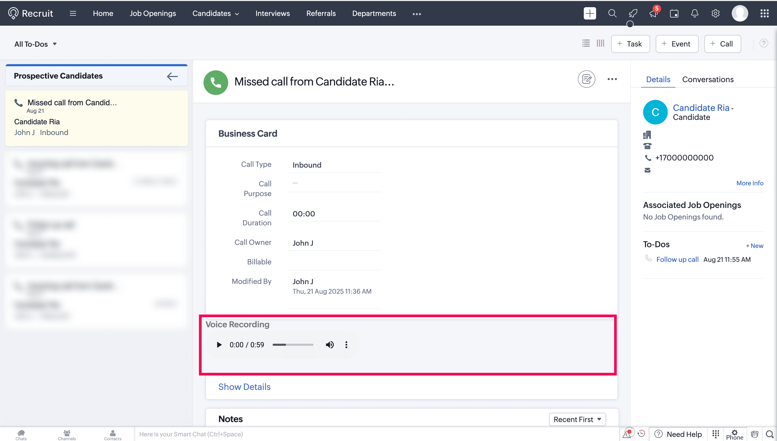 Call logs will be updated automatically under the To-Dos modules in Zoho Recruit.