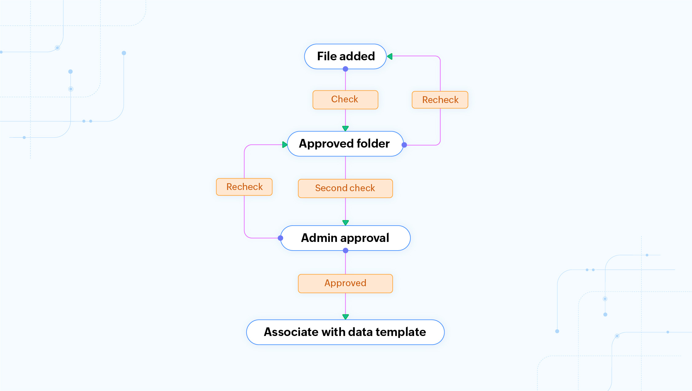 Based on the data template, the file is moved to its specified subfolder, where it is reviewed and potentially sent back for changes.