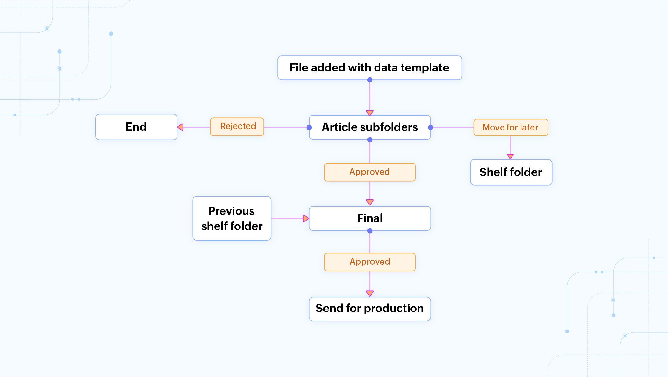 A simple workflow isn’t enough, multiple linked Team Folders are necessary to ensure the same fine-tuned approval process goes smoothly. A workflow example of approving articles for a newspaper on WorkDrive would be something like this:
