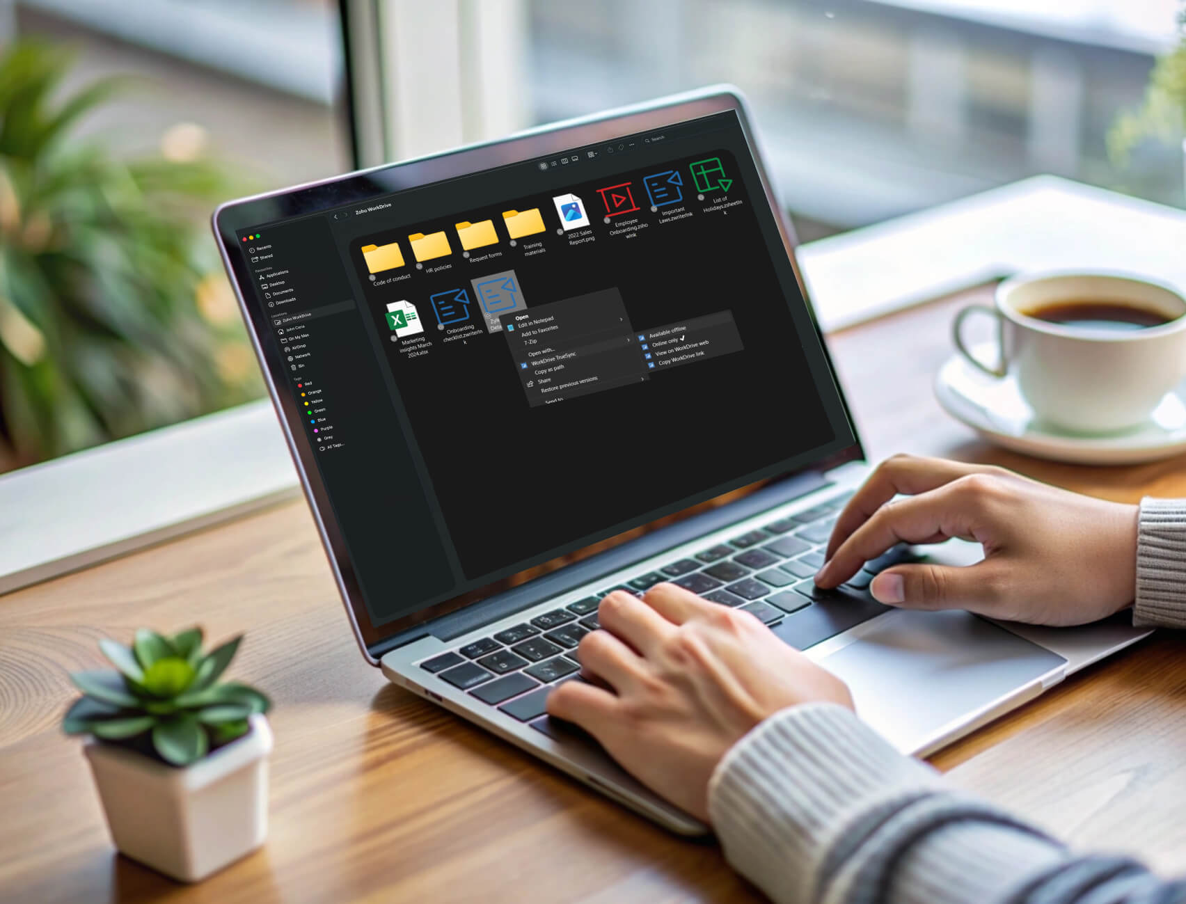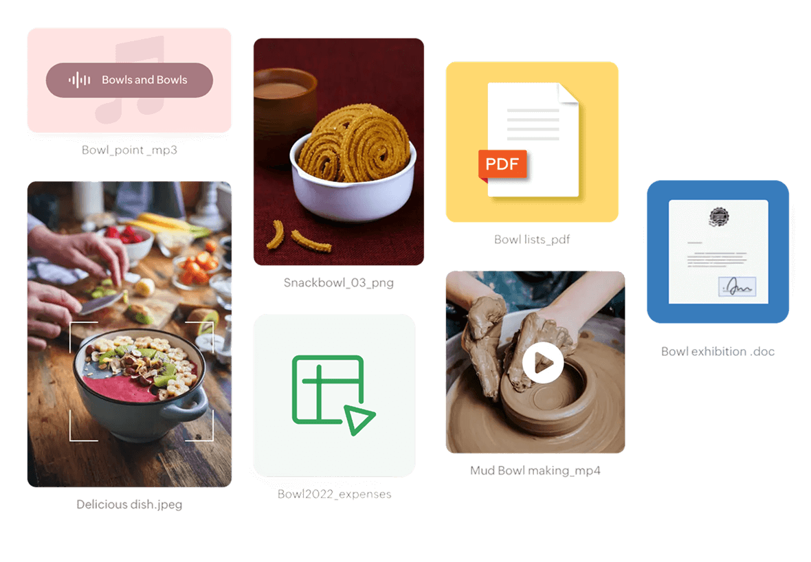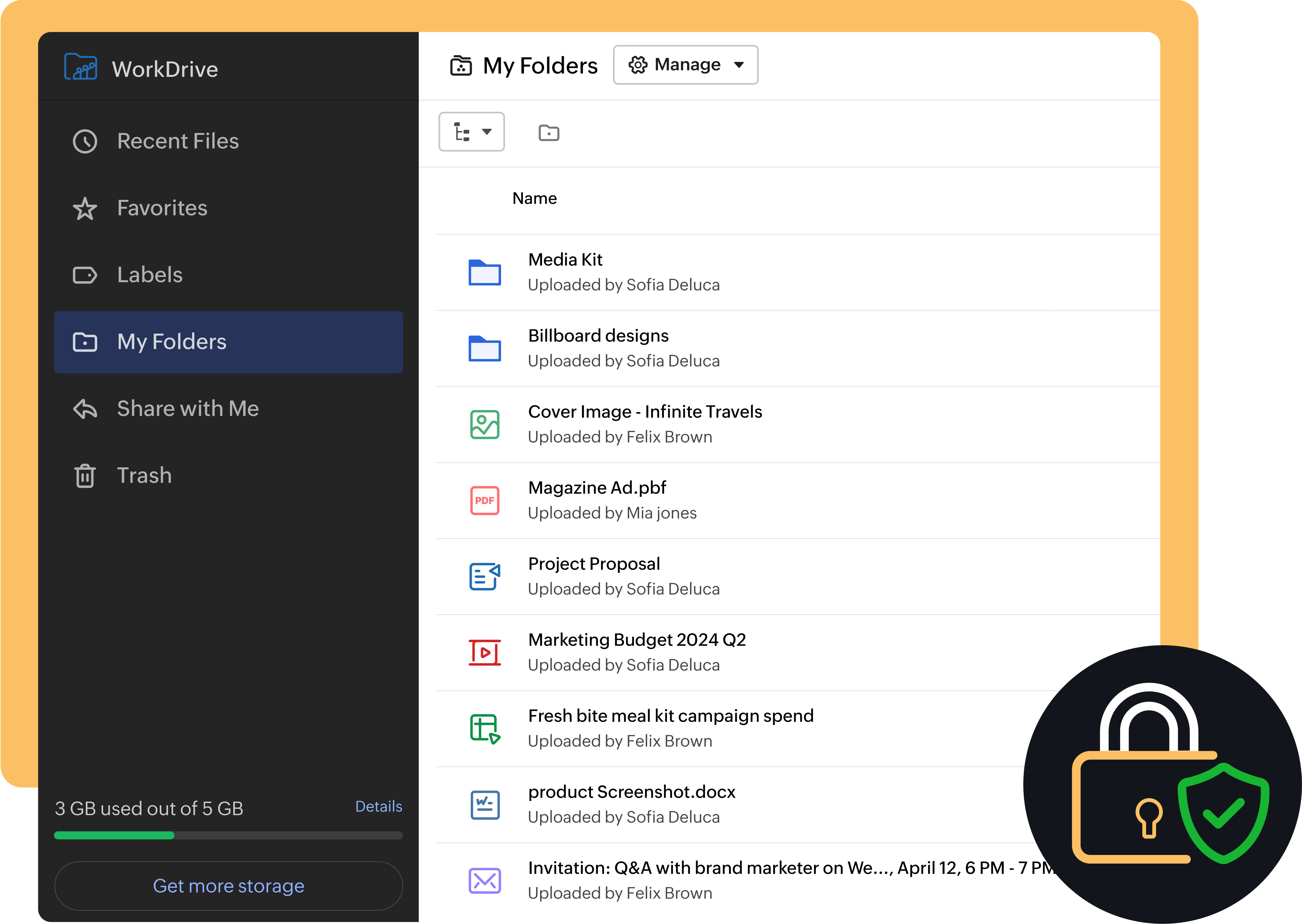 Keep every file safe and accessible in WorkDrive. Store, organize, and preview over 200 file formats—all from one centralized, secure platform.