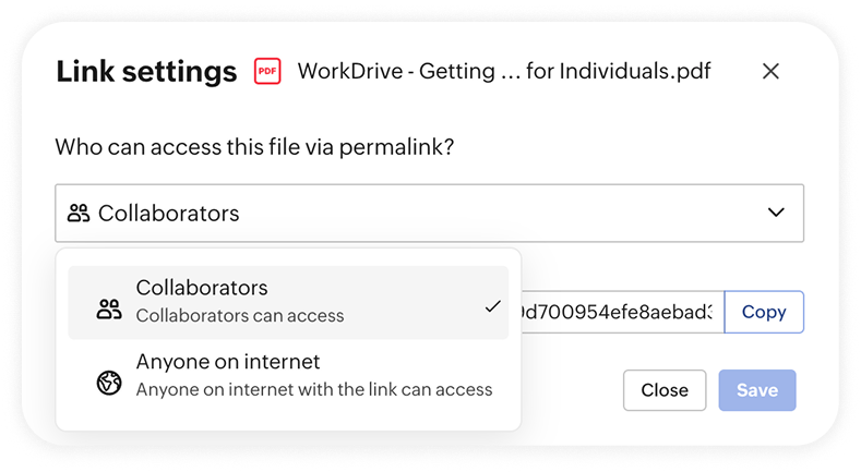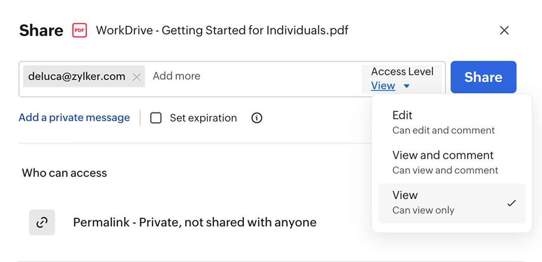 Sharing large files is quick and simple with WorkDrive. Share files via email and assign the required permission based on what you want recipients to do.