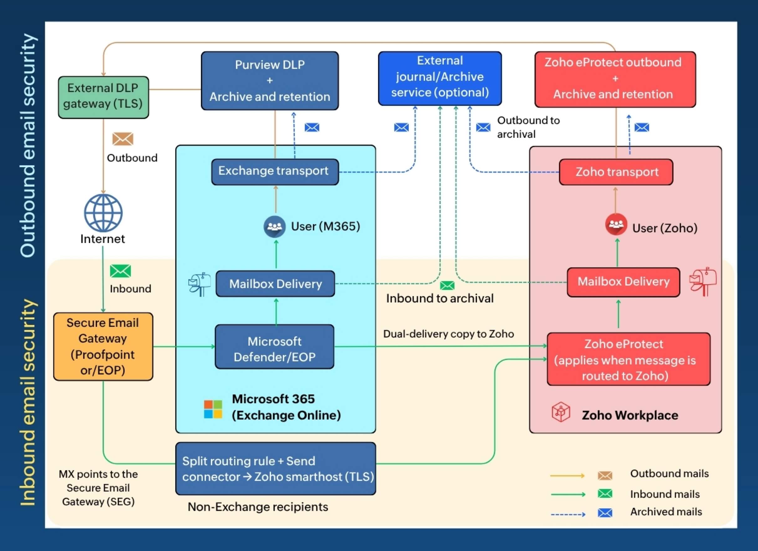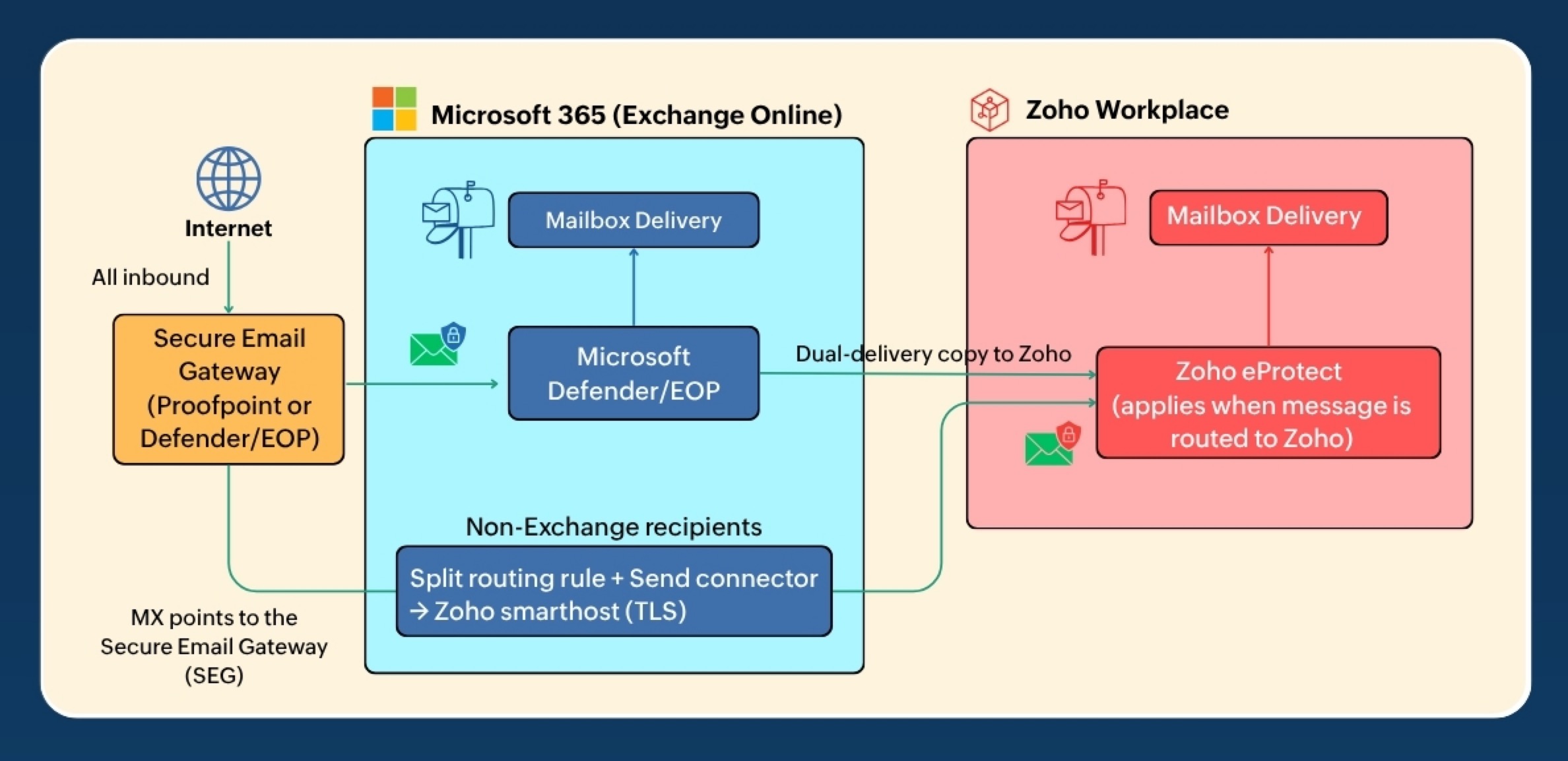 | Dual delivery | Policy: “Deliver to both pools”. SEG forks messages. Copy 1 → Exchange Online (SEG + Defender/EOP). Copy 2 → Zoho Mail (SEG + Zoho eProtect). |