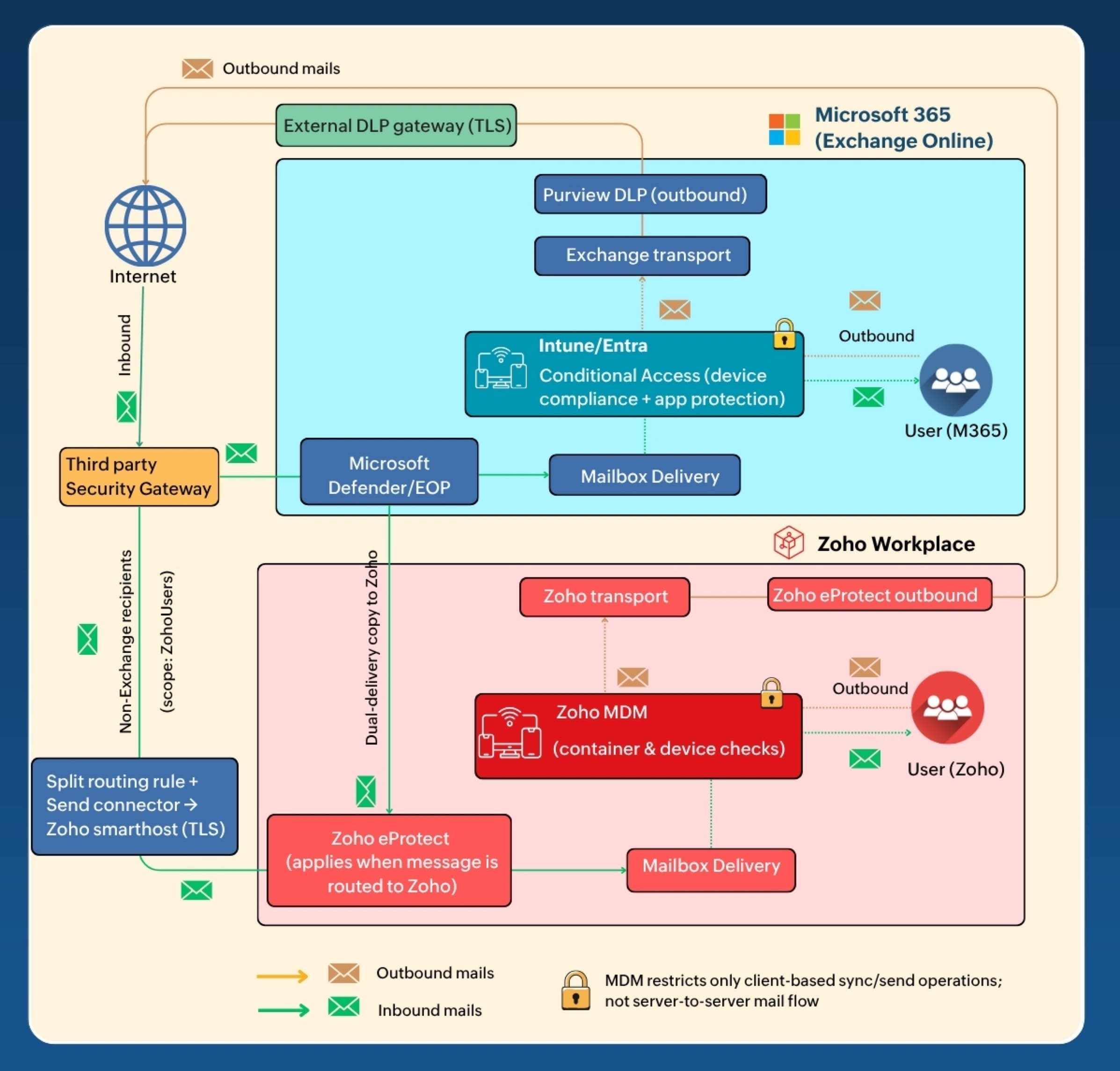 | Recipient resolution | SEG checks synced directory, LDAP/Entra ID, or static routing maps. SEG decides route: M365, Zoho, or both. Policies enforced at SEG. |
