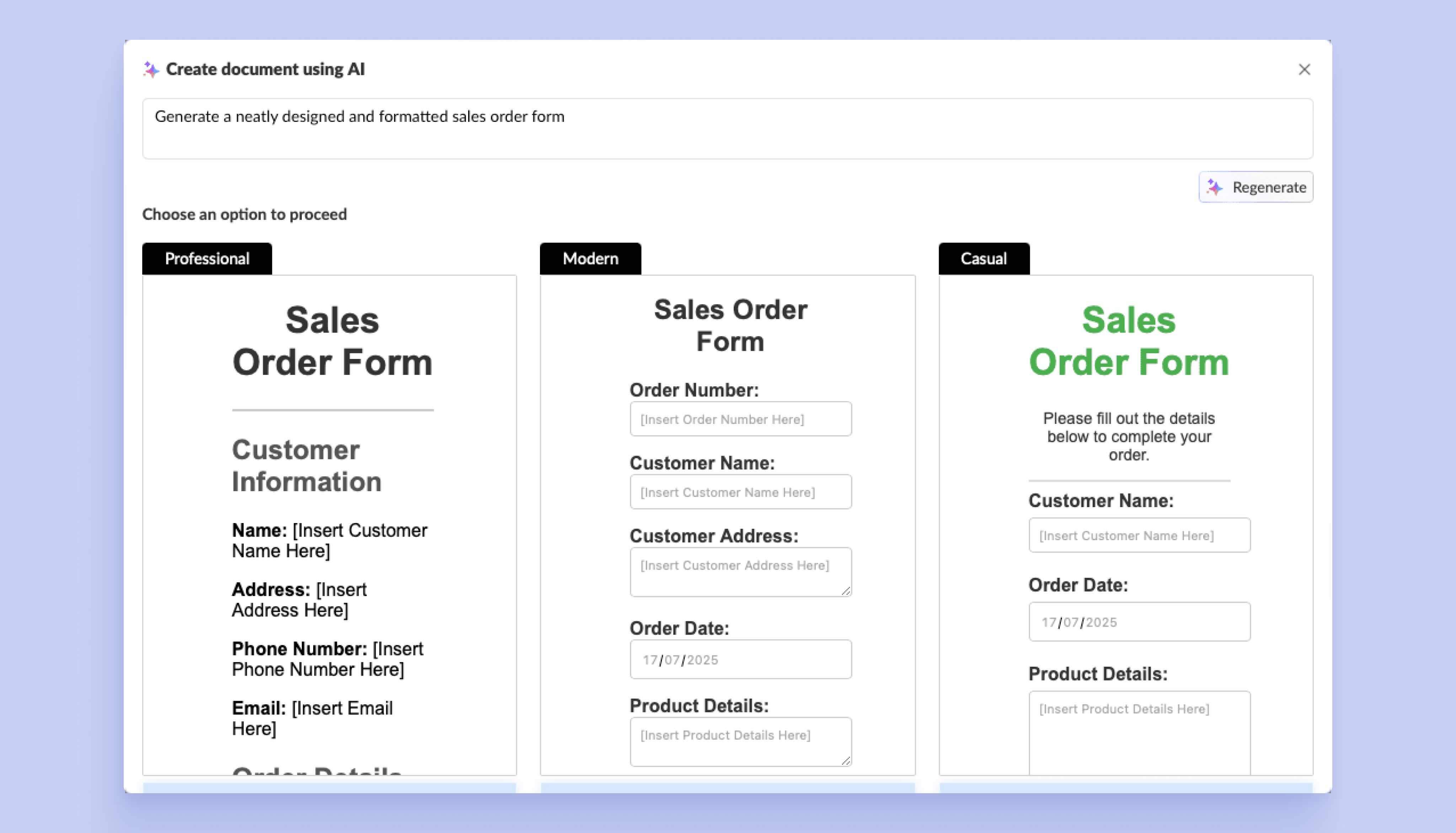 Zia can build templates and full documents for many business scenarios like sales orders, proposals, purchase orders, NDAs, offer letters, and more with layout and content.