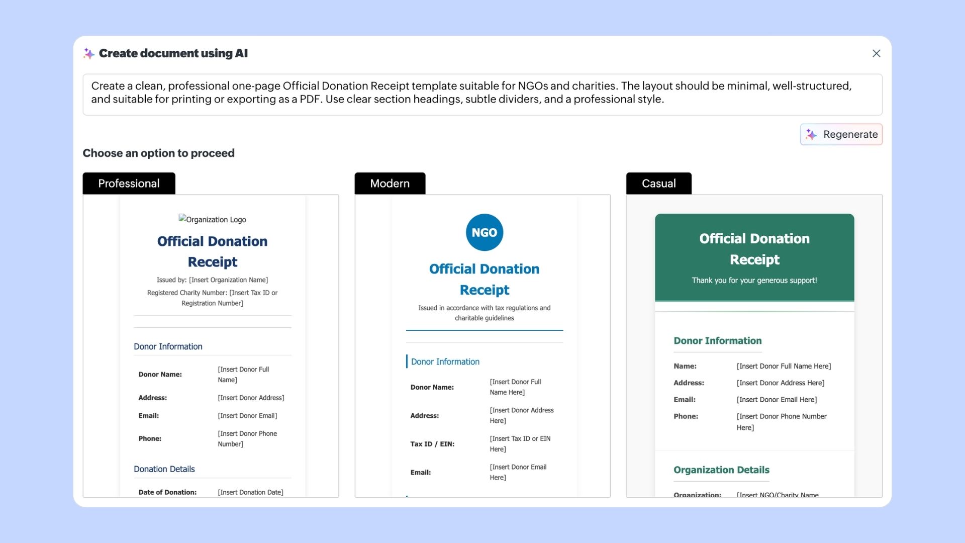 “Create a one-page donation receipt template for an NGO that donors can use for tax benefits (e.g., 80G in India). Include NGO details, donor details, amount, payment mode, tax disclaimer, and space for signature and seal.” - Click Generate. Writer’s AI will create three different template styles (for example, professional, modern, casual).