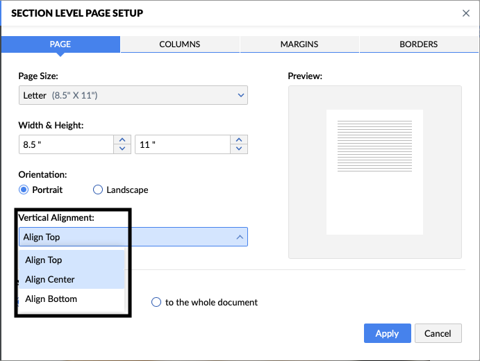 - In the dialog that opens, go to the Vertical Alignment dropdown, select Align Center, Top, or Bottom as required, and click Apply.