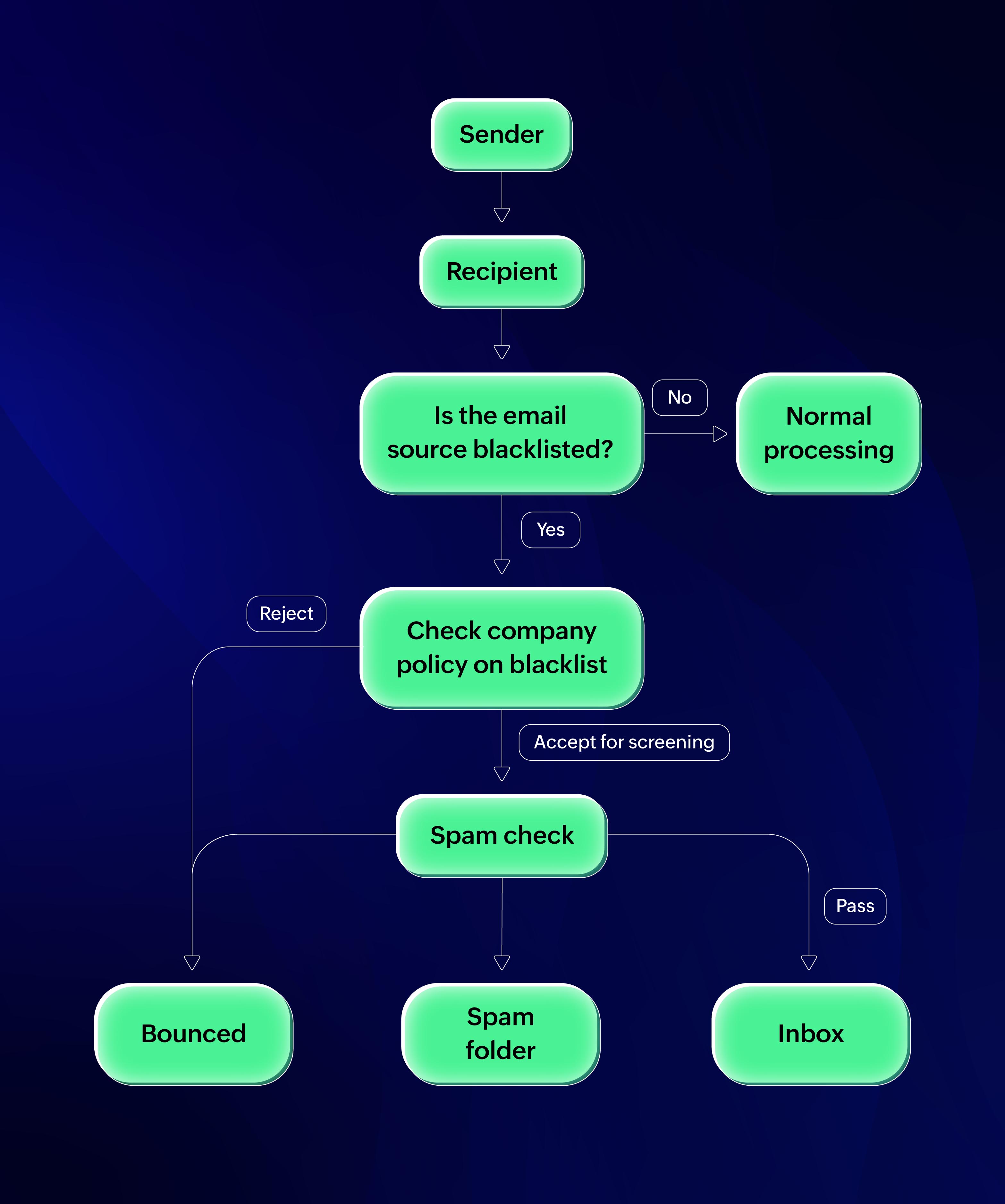 Every ESP has a set of blacklists that they trust or, in some cases, they have their own blacklist. When an email is received by the ESP, it refers to these blacklists to see if the sender is on the list. If the answer is no, the email goes through the normal process of being processed. If the answer is yes, depending on the company's policy on blacklisted emails, the emails can be rejected or directed to the receiver's spam folder.