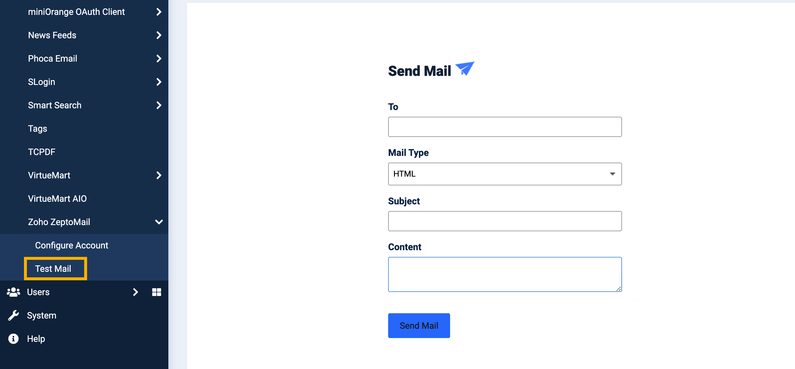 - Under ZeptoMail drop-down, select Test Mail.