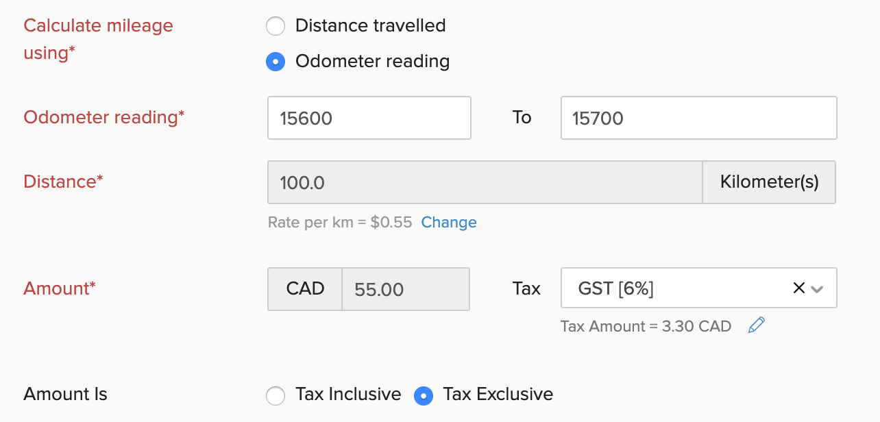 The expense amount is auto-generated based on the distance and the mileage rate. You can also apply tax on the expense, if applicable. The amount can be Tax Inclusive or Tax Exclusive.