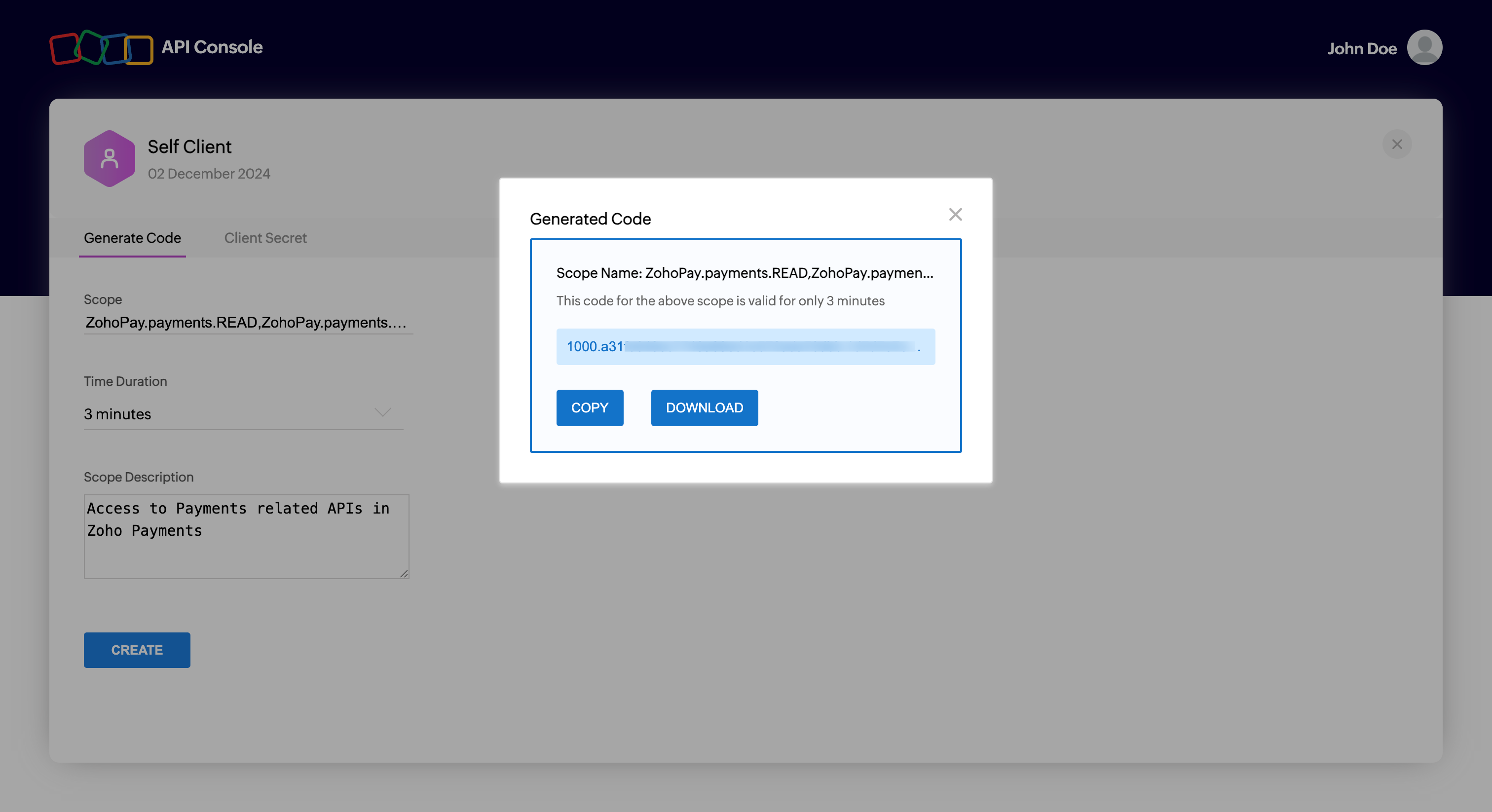 6. Click CREATE. An authorization code will be generated and displayed.