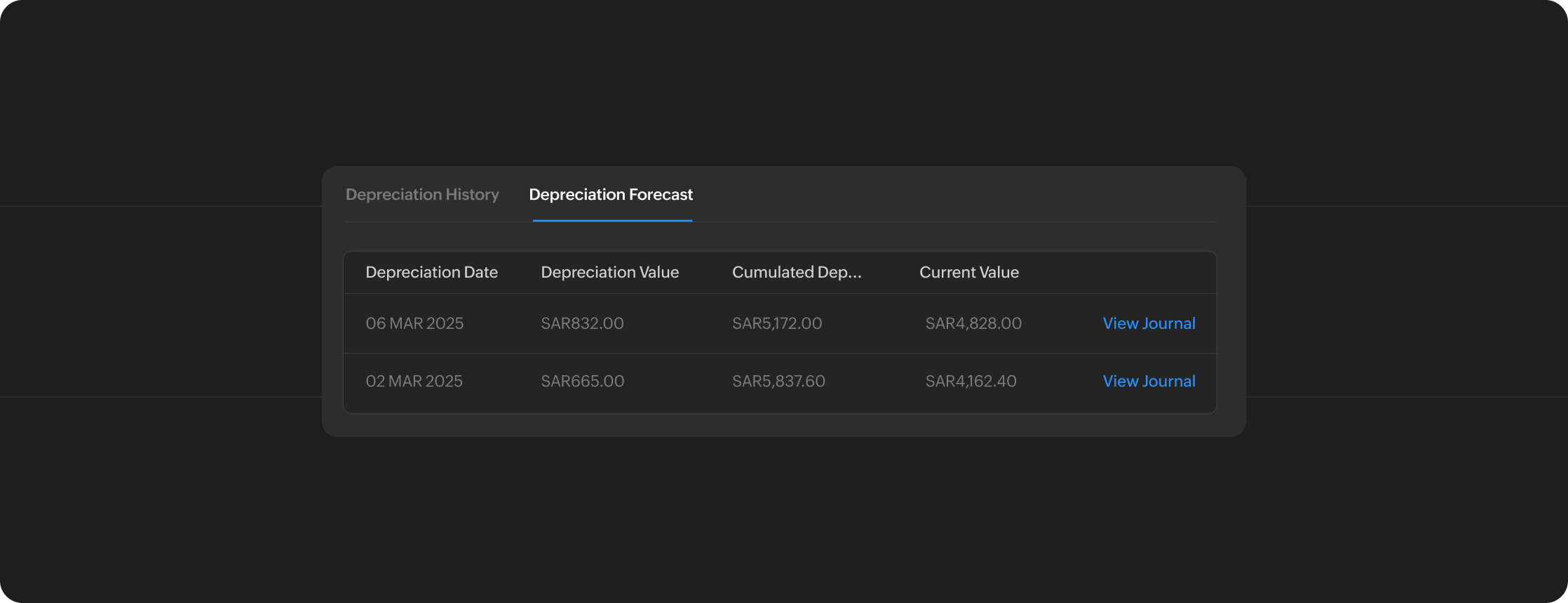Visualize asset depreciation trends over time with intuitive charts.