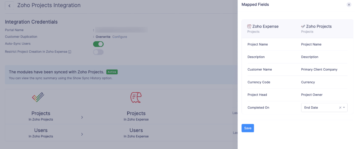 - If you reintegrate the same Zoho Projects portal with this organization, the records synced during the previous integration will be synced again, leading to duplication of records in Zoho Expense.
