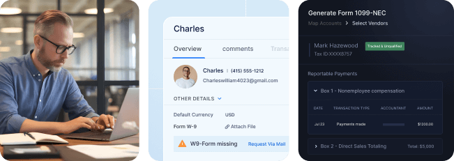 Refine your 1099 reports without hassle. Add or exclude transactions as needed, update missing vendor details like address or email, and quickly track any overlooked vendors—all from one screen. Every change is saved in a detailed comment and history log, ensuring full visibility over report updates