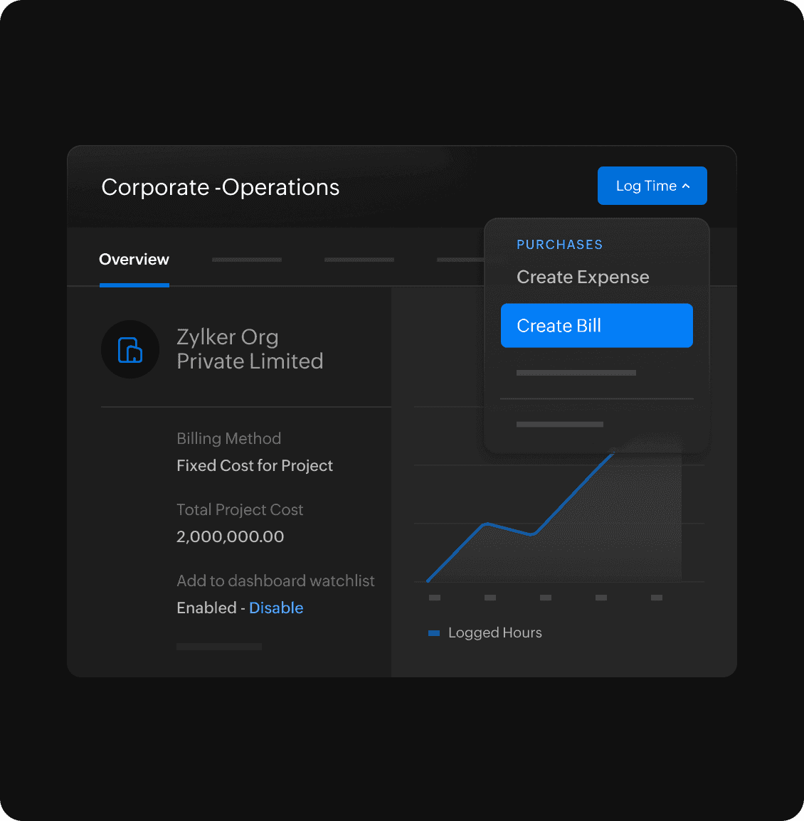 Create bills from projects module when making purchases for projects. Here, both the project and the customer are automatically tagged for easy reference, tracking, and cost recovery.