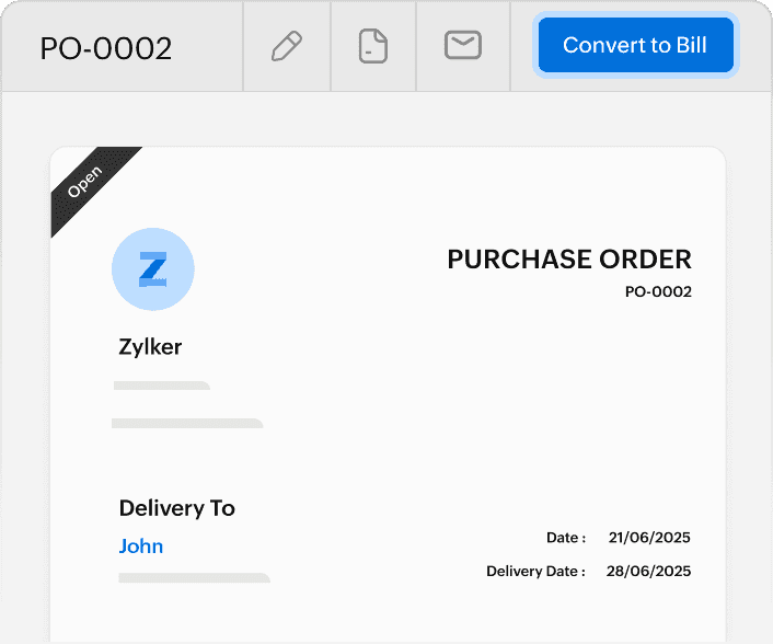 Convert fulfilled purchase orders into bills with a click, avoiding the need to create bills from scratch. Make any adjustments based on what you’ve arranged with the vendor.