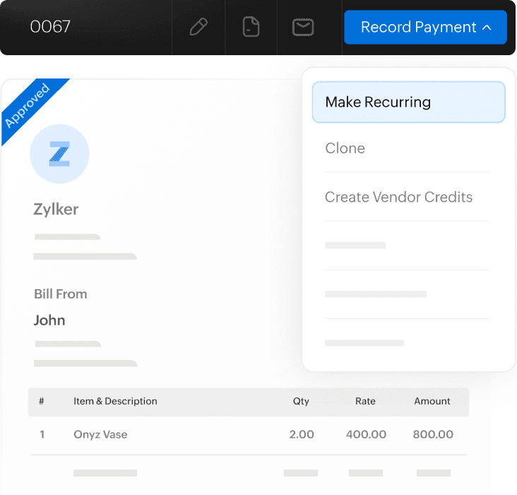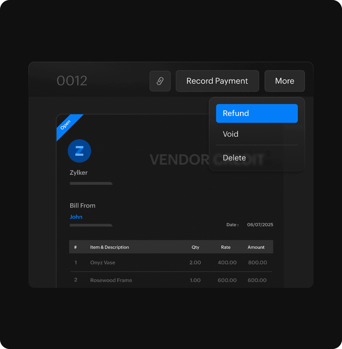 Made a purchase return or paid in advance? Record refunds and advance payments as credit notes. Zoho Books will remind you to use these vendor credits on your subsequent purchase bills for the vendor.