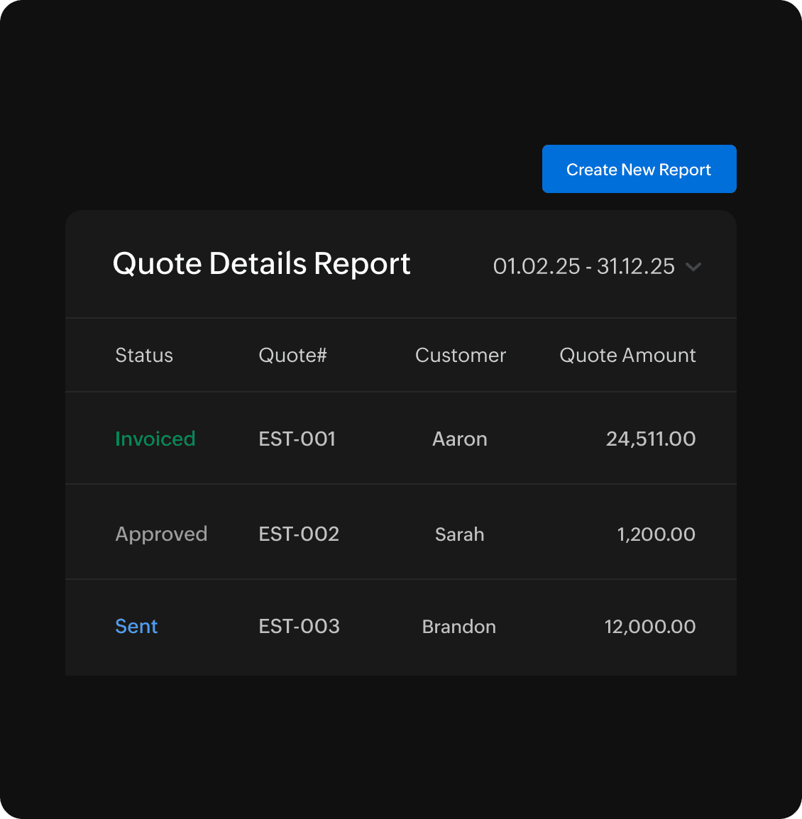 Generate a summarized quote report that shows the quotes you have sent to your customers and their current status. Use these insights to optimize your sales process, pricing strategy, and win rate.